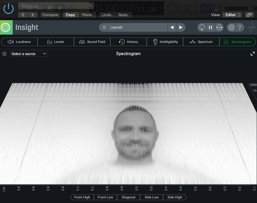 I edited the image I was processing to remove any background content, so that there was a clear definition between foreground and background. When running this sound through a spectrogram (for which I used Izotope’s Insight 2), the original image is visible in the spectral content (